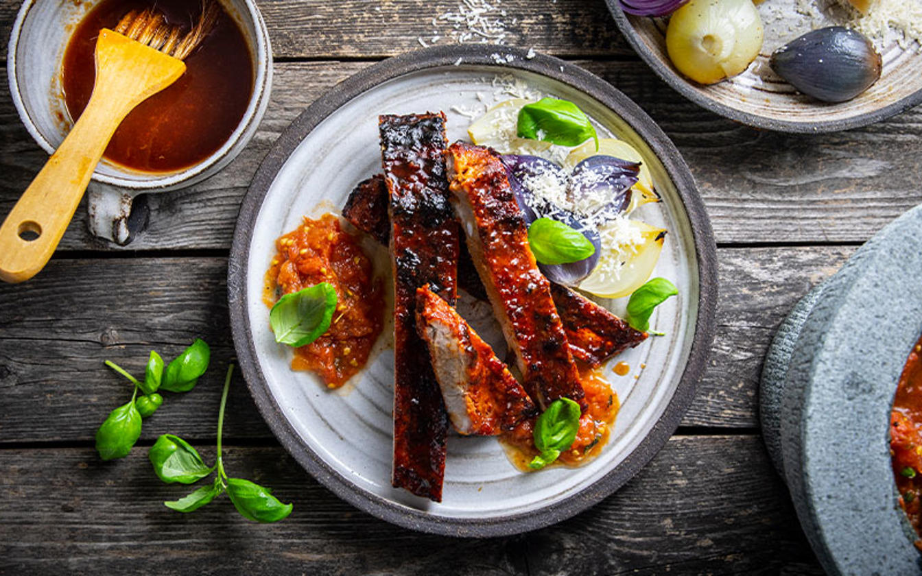 Spareribs med äppel- och ingefärsglaze, grillad tomatsalsa och glödbakad lök.