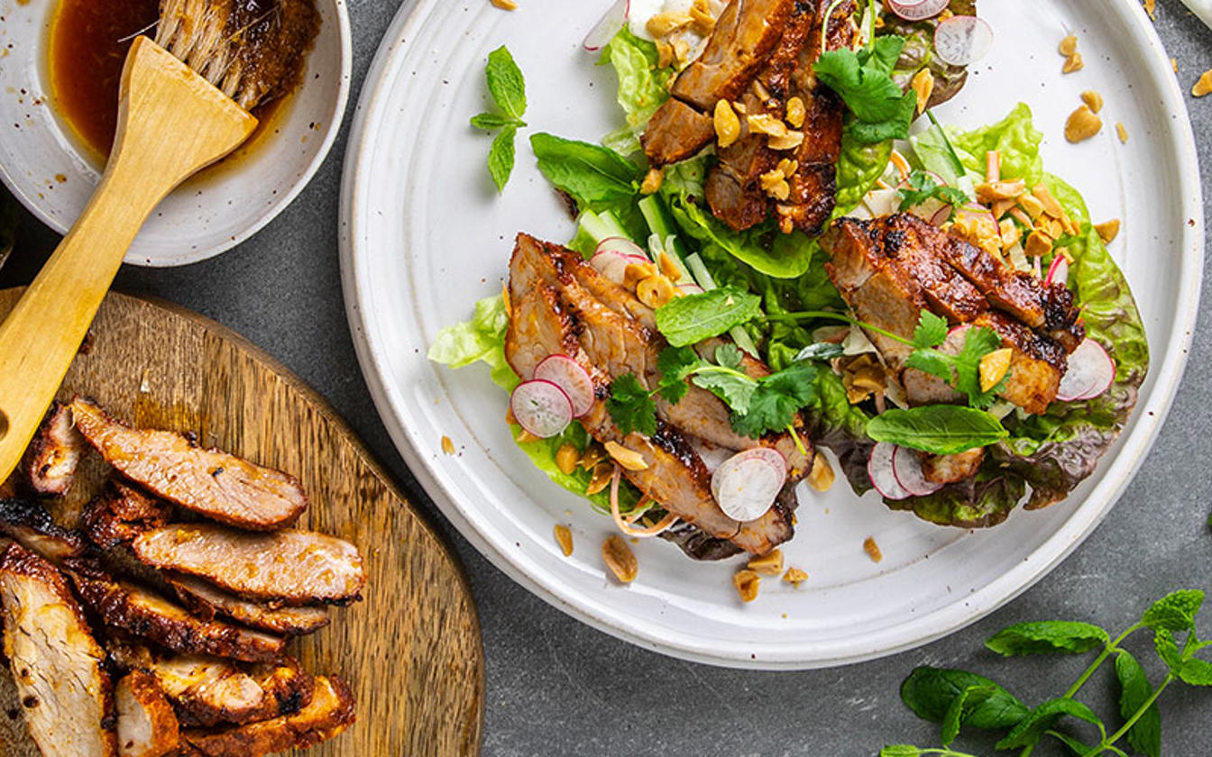 Med sesam- och limeglaze, mynta- och jordnötssallad och en krämig coleslaw.