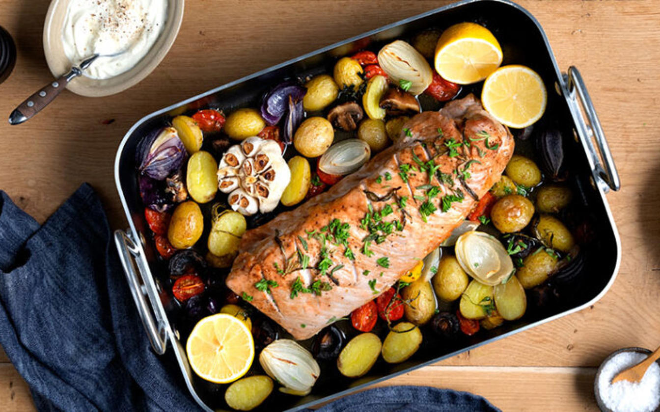Fläskytterfilé är en detalj som går utmärkt att laga i ugnen. Här tillagas den tillsammans med potatis, cocktailtomater, champinjoner och lök. Slutligen ringlar du över en smakrik senapsdressing och maten är redo att servera!
