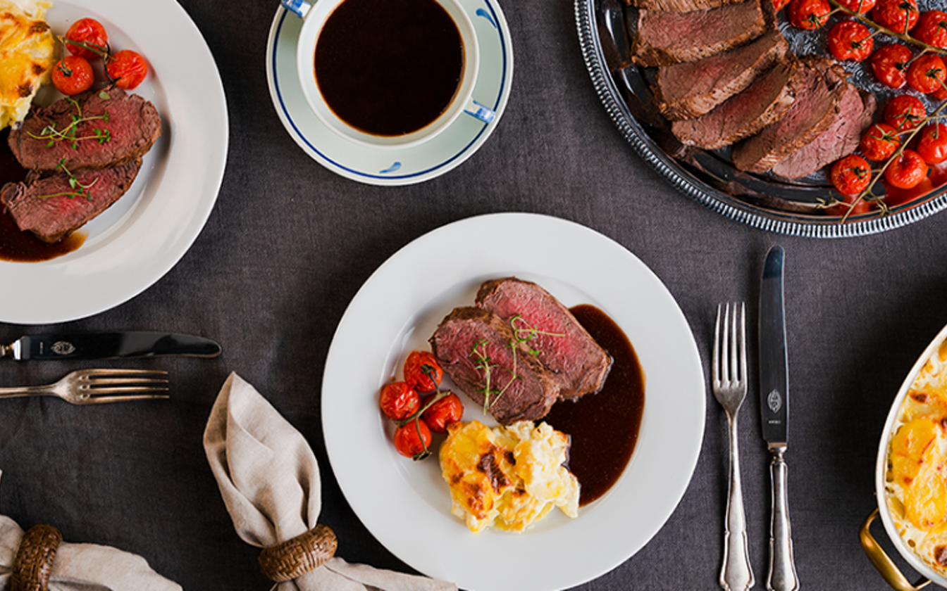 Rostas är en detalj som kommer från den mörare delen av rostbiffen och är ett prisvärt kött. Här hittar ni ett recept på helstekt rostas med krämig potatisgratäng och klassisk rödvinssås. Perfekt att bjuda till festmiddag.