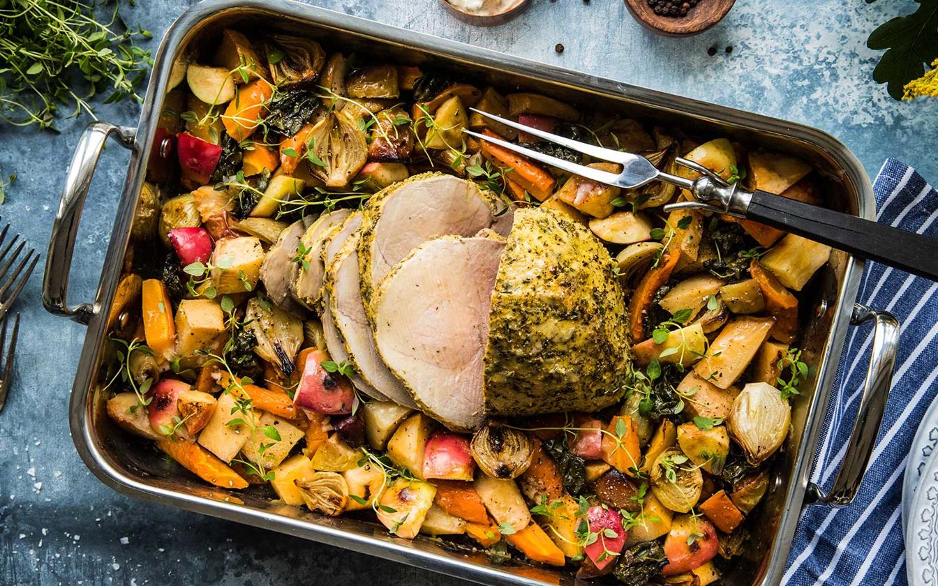 Senapspenslad, helstekt skinkstek som tillagas tillsammans med rotfrukter och äpple i en ugnsform.